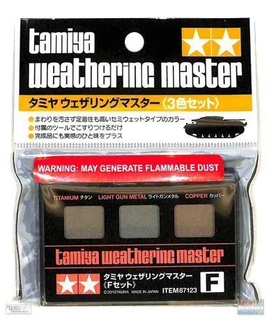 A WEATHERING MASTER F SET (TITANIUM/ LIGHT GUN METAL/COPPER) The Gleam of Metal This set of Tamiya Weathering Master pigments enables you to easily recreate the appearance of metal.