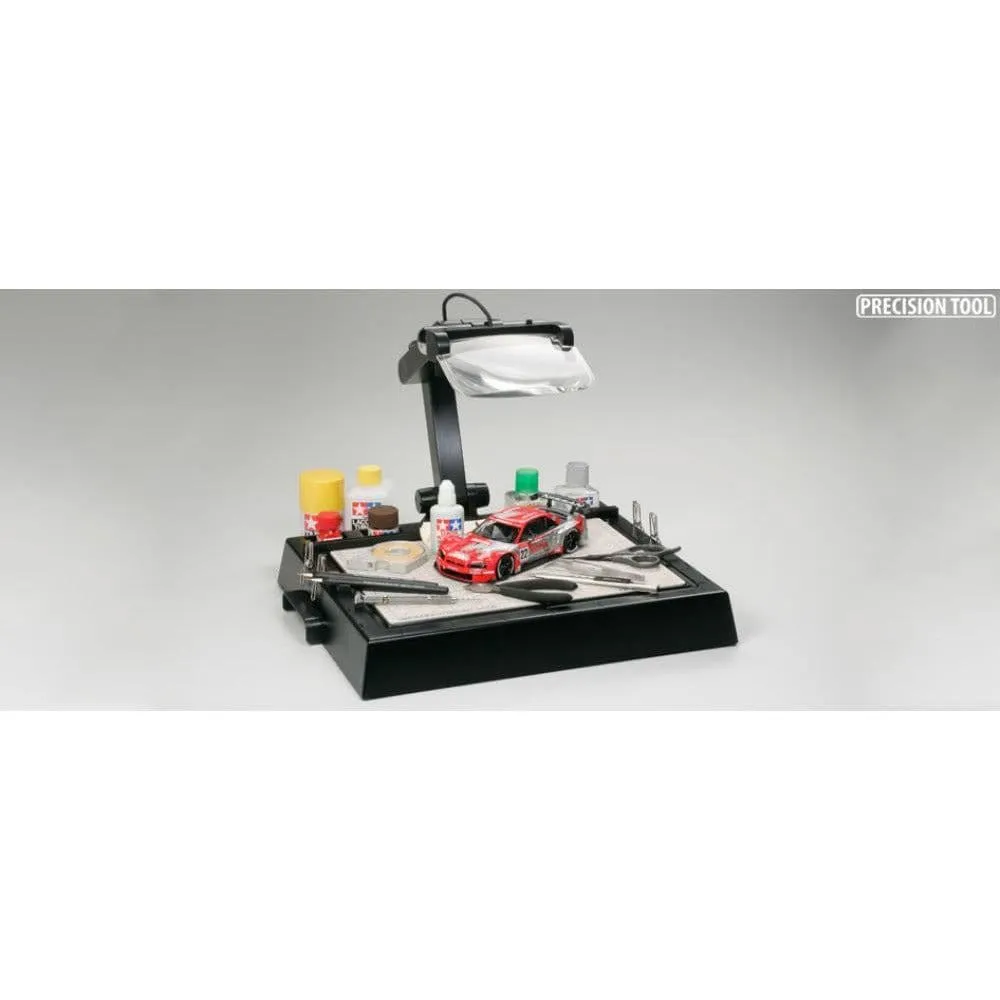 Although specially designed for Tamiya modelers, this handy work place is perfect for any type of fine work requiring good light and clear vision. From all types of arts and crafts such as carving, painting, embroidery and beading to handy everyday uses, the possibilities are truly limitless.