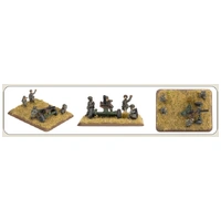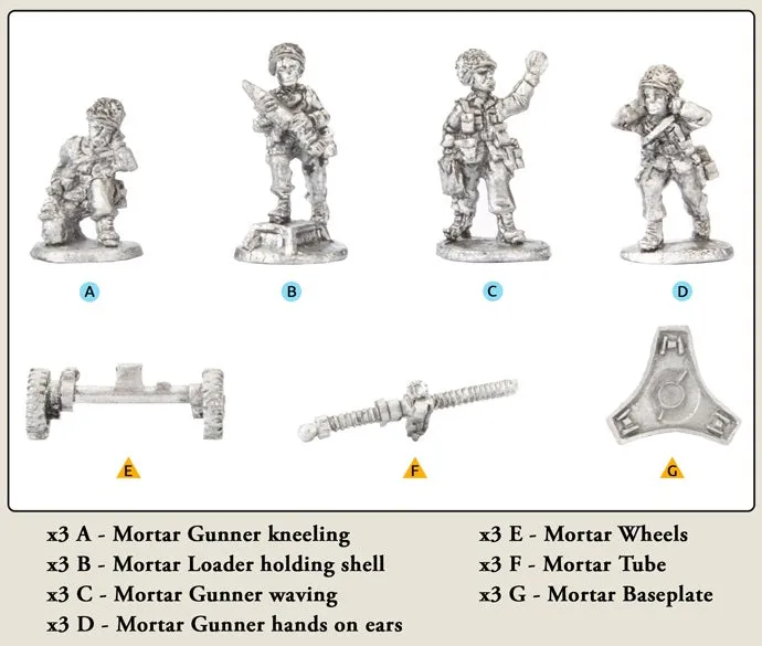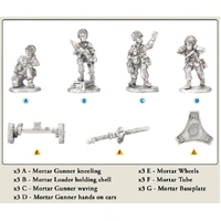 The Mortier de 120mm Rayé Tracté Modèle F1 (120mm rifled towed mortar, model F1, RT F1 for short) is a heavy mortar of French design. Each infantry regiment has a battery of six RT F1 120mm mortars to provide the four mechanised infantry companies of the regiment with indirect fire support. This mortar system has excellent range, delivering fast and effective bombardments on enemy positions, as well as providing covering smoke when required. The RT F1 mortar can be towed by a variant of the VAB fitted with racks for the 120mm mortar ammunition or a similarly modified version of the AMX-10P infantry fighting vehicle. THIS PRODUCT CONTAINS: 3x metal 120mm Mortar Teams --- These miniatures are supplied unassembled and unpainted