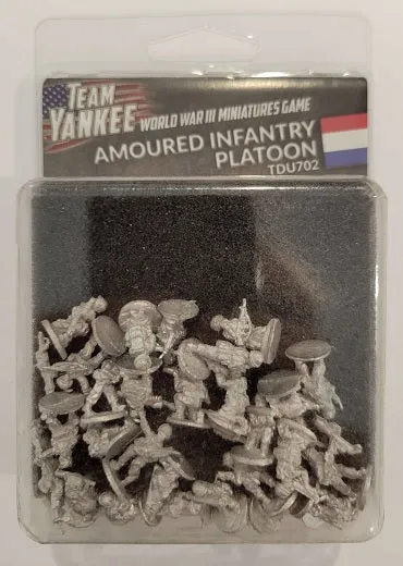 Each armoured infantry platoon (pantserinfanterie peloton) is made up of four groups. The platoon command group is mounted in a YPR-765 armoured infantry fighting vehicle and has one 7.62mm FN MAG GPMG and two M47 Dragon anti-tank guided missile systems. The three infantry groups (designated A, B and C), each mounted in a YPR-765, are equipped with one 7.62mm FN MAG GPMG and one Carl Gustav 84mm anti-tank weapon. Equipment also includes disposable M72 LAW 66mm anti-tank rockets. THIS PRODUCT CONTAINS: Metal Infantry Figures 1x Formation Commander FAL rifle team 4x GPMG teams with M72 anti-tank weapons 3x Carl Gustav anti-tank teams 2x M47 Dragon Missile teams --- These miniatures are supplied unassembled and unpainted