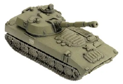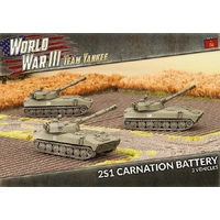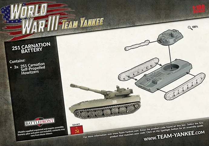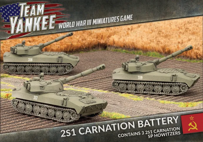 World War III Team Yankee: Soviet 2S1 Carnation Battery The 2S1 Carnation is a Soviet 122-mm self-propelled 2A18 howitzer. The 2S1 is fully amphibious with very little preparation, and once afloat is propelled by its tracks. A variety of wider tracks are also available to allow the 2S1 to operate in snow or swamp conditions. Package Contents: - 3 x resin and metal 2S1 Gvozdika 122mm self-propelled Howitzers Package Info: - Product is for use in the Team Yankee / Flames of War: WWIII miniature table top game. - Models may require assembly. - Any scenery, paint, or glue shown is sold separately. Country/Faction: Soviet Union Product Part Number: TSBX07