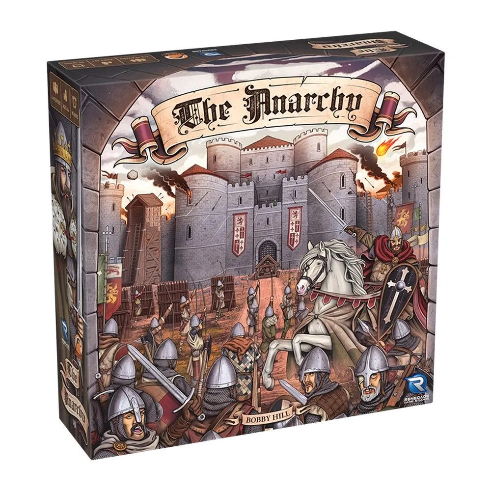 In The Anarchy, players take on the role of English nobles loyal to King Stephen. Over five rounds, players must build their domain, defend their castle from attacks by the approaching Angevin armies, and storm strongholds loyal to Matilda with their own crafted siege weapons. The player who can accumulate the most bravery, loyalty, influence, and might, while avoiding discontent, will prove to King Stephen they are his most loyal ally, thereby earning his largest earldom.