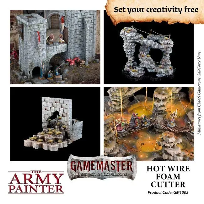 This incredibly precise Hot Wire Foam Cutter will give you clean, accurate and fast cuts – every time! It is the perfect tool for cutting XPS foam sheets for any dungeon backdrop, wargaming terrain or landscape scenery. Including 4 extra wires.