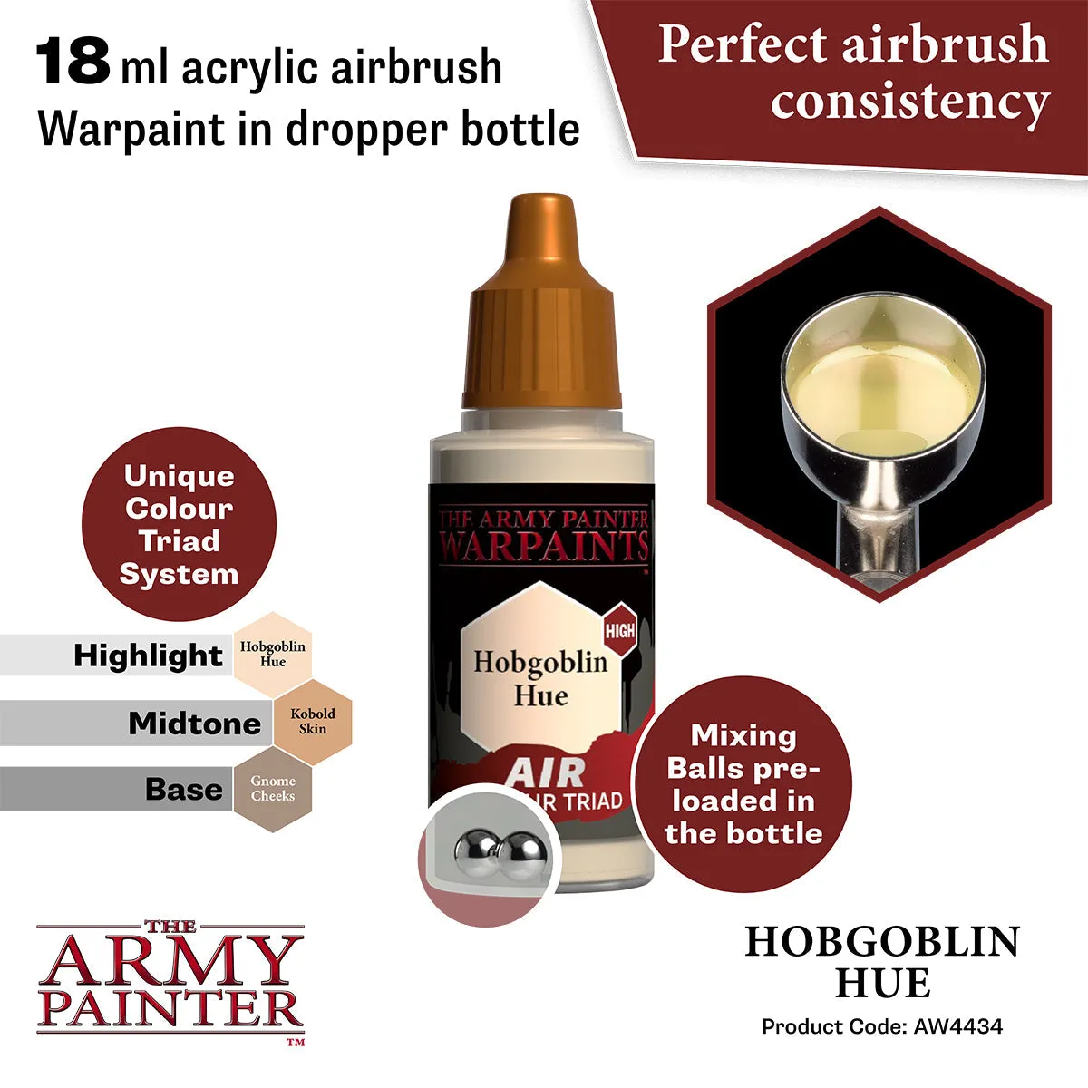 All Warpaints Air are pre-mixed and airbrush-ready right out of the bottle and made from ultra-filtered vibrant pigment. The Warpaints Air range has been developed in a unique and innovative Triad System - each matching Warpaints Acrylics colour has a corresponding Base and Highlight colour. This makes highlighting and zenithal shading a breeze and army painting even faster and more cohesive. To make things easier Warpaints Air comes pre-loaded with two steel Mixing Balls.