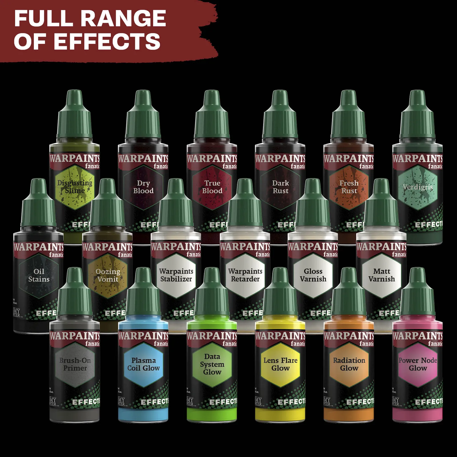 Adding effects to your miniatures and armies can really take your projects to the next level! Specialist tools for theme and narrative, Warpaints Fanatic Effects range from high gloss to ultra-matt, textured to radiating! Use Fanatic Effects to add gory elements, realistic rust, or a simple glow to a lens, power weapon, or magical conjuring! Warpaint Fanatic Effects also work great when weathering or basing your miniatures! Comprehensive range of 216 colours Insanely pigment-dense formulation Superior brush feel, smooth application Flexible Colour Triads High-quality acrylic paint Mixing balls pre-loaded in each bottle