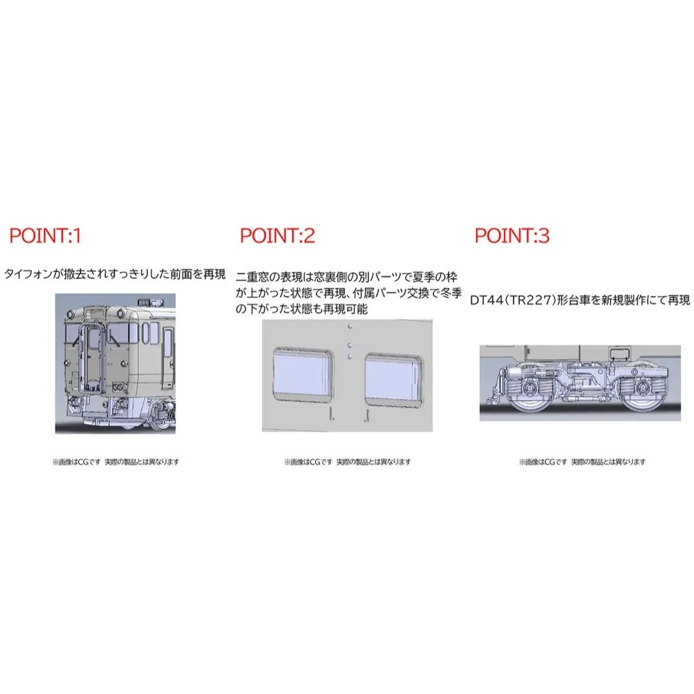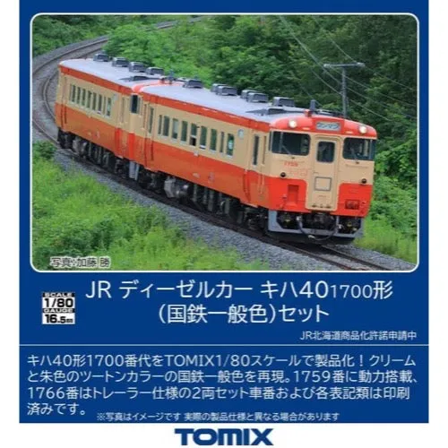 The Kiha 40 series is a general-purpose diesel car that has been in operation since 1977. Of the updated 1700 series cars in operation in Hokkaido, two cars, 1759 and 1766, have been painted in the standard JNR color of vermilion and cream as part of the 2021 Kushiro region anniversary event, attracting attention. Features - A set of two cars, No. 1759 and No. 1766, are reproduced in a two-tone cream and vermilion color - No. 1759 is equipped with a power unit, while No. 1766 is trailer-equipped - The front is reproduced to look like it has no typhoon - The underfloor reproduces the various equipment that has been updated in the actual car, such as the DMF13 engine - The front display unit is interchangeable and comes with printed parts for "One-man, Rapid One-man, and Local (navy blue)" - The side indicator lights are already attached with clear parts - The car number and various notations are printed - Head and tail lights have an ON-OFF switch - The headlights light up a color close to incandescent, and the front display unit lights up a color close to white - Equipped with a cab interior light that lights up the cab when rearward - Sealed self-locking TN coupler is standard equipment - Can pass through a minimum radius of R490 (excluding S-shaped linear tracks) Contents Vehicles - Kiha 40-1759 (M) - Kiha 40-1766 (T) Accessories - Runner parts: Front display section - Runner parts: Handrail - Runner parts: Whistle - Runner parts: Signal flare - Runner parts: Step - Runner parts: Jumper plug hose - Runner parts (etching): Wiper - Runner parts (etching): Nameplate - Parts: Air hose - Parts: Hood frame - Sticker: Destination display, etc.
