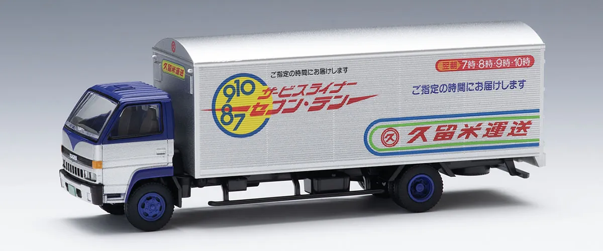Piggyback Truck B (Kurume Transportation) Features - Reproduces the truck that was installed and operated on Kum 80000 and Kum 1000 freight cars from 1986 to 2000 - Reproduces the cab shape of the Isuzu Forward Juston - Cab glass is reproduced with clear parts - Tires use rubber material for a realistic texture - Front and rear wheels are rotatable (front wheel steering is non-movable) - Some markings such as number plates are omitted