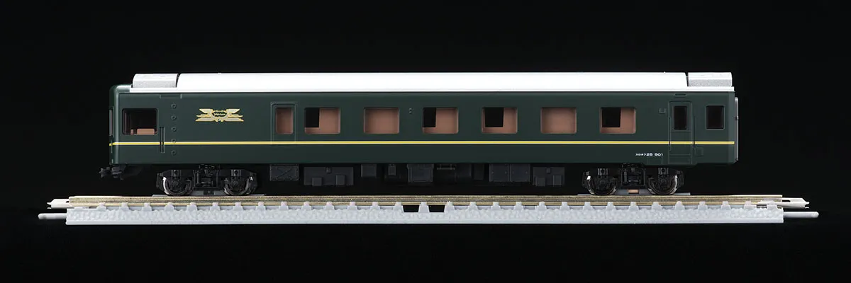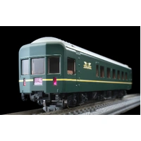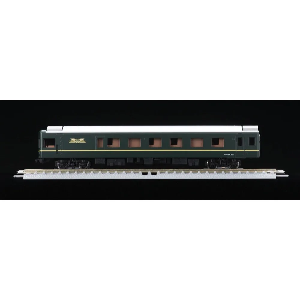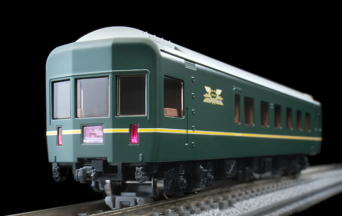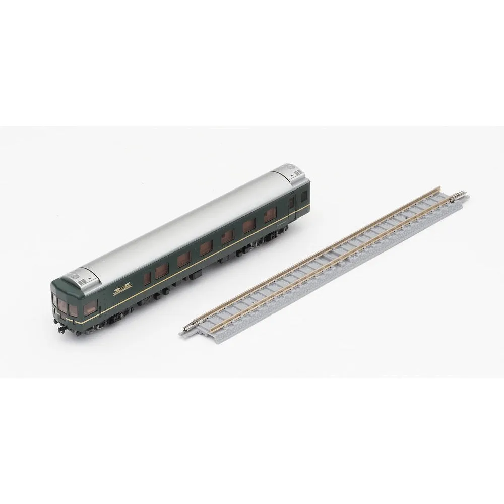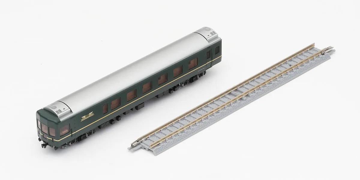 The Twilight Express is a sleeper express train that began operation in 1989. It was green instead of the traditional blue color scheme, and had luxurious passenger compartments, making it very popular. Features - First Car Museum products that allow you to easily display and enjoy precise N gauge model trains - Train marks are printed - Train marks and tail lights can be lit using the separately sold FM-017 power unit and power unit DC feeder - Train marks and tail lights are equipped with a constant lighting circuit board - Train marks and tail lights are lit by white LEDs - Uses black wheels - Includes straight rail S158.5(F) for immediate display (unprinted) - Straight rail S158.5(F) can be connected to conventional Finetrack - Wheel stopper parts to prevent rolling already installed *Cannot be driven using the power unit *Cannot be coupled as there is no coupler