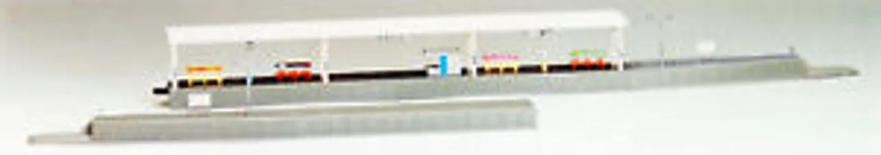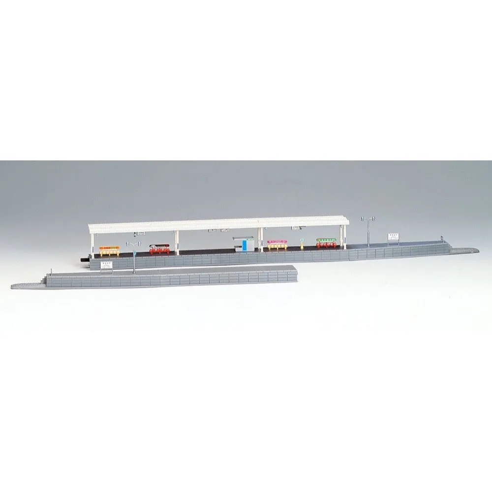 Features - This is the most basic modern type of island platform. - It is made up of four blocks, and the blocks are connected with one-touch joiners. - The clock, speakers, etc. are reproduced as separate parts - Stickers for station names and advertising boards are included. - It can be extended using the extension part (sold separately). Details - Curved end platform R - Unroofed platform 140mm - Roofed platform 280mm - Curved end platform L - Runner parts: benches, ashtrays, station signs, etc. - Parts: platform light, shops, stairs - Parts: joiners - Stickers