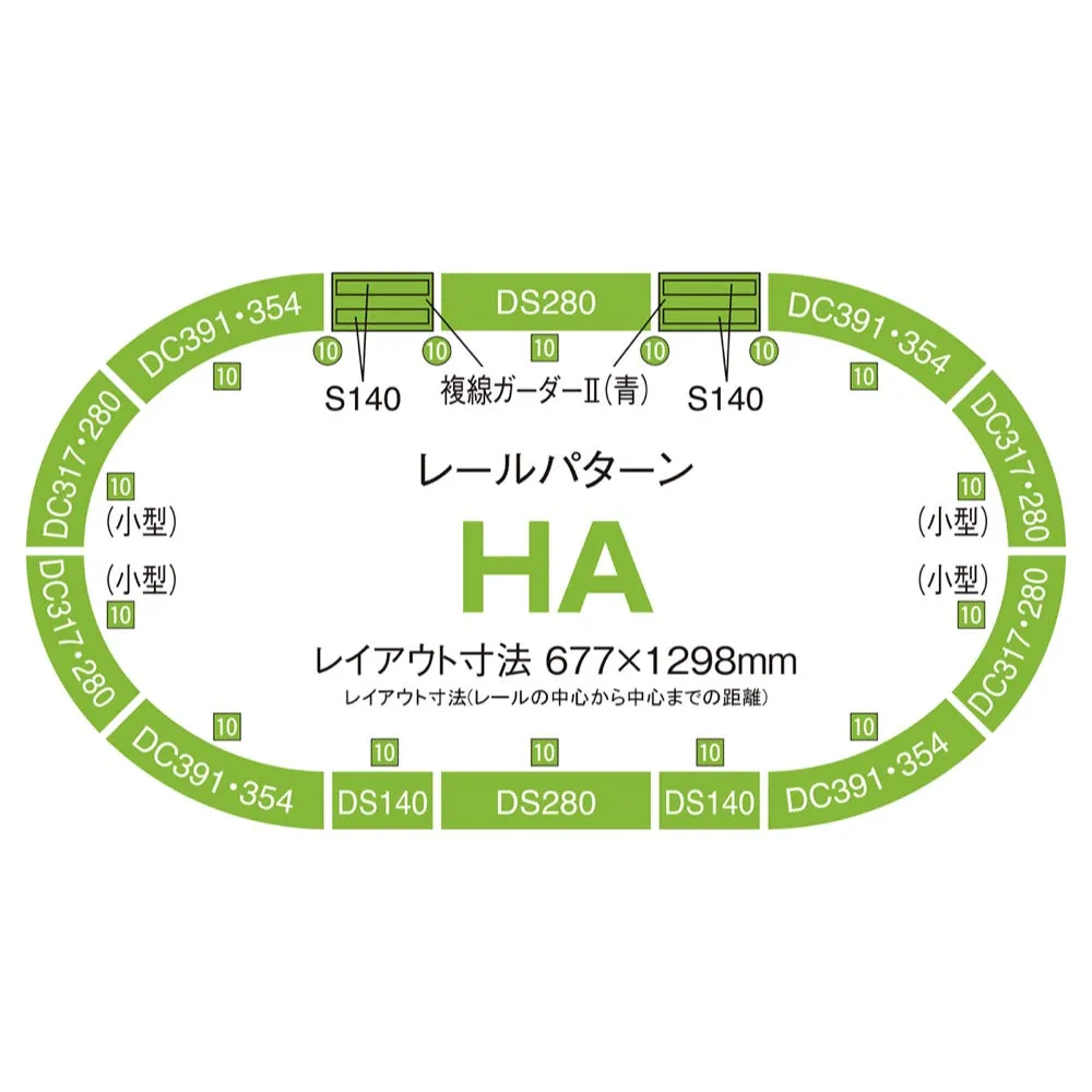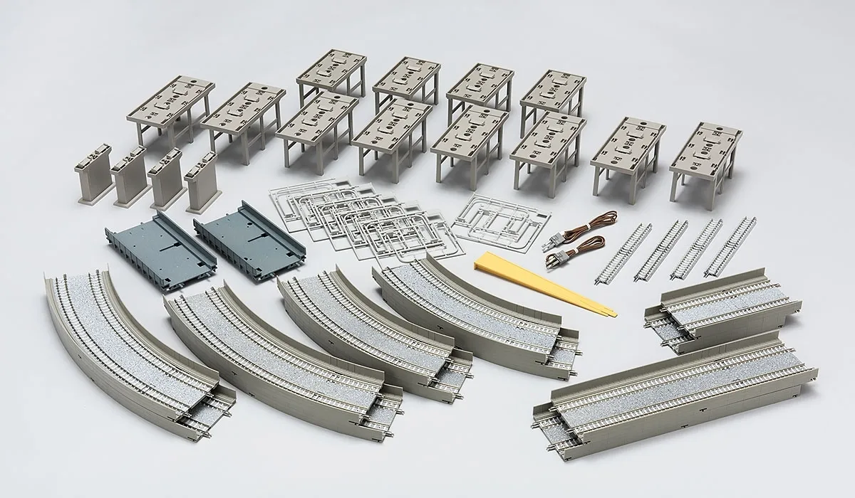 This set is perfect for beginners who want to easily create an elevated double-track layout with just this set. It also comes with a double-track girder bridge, which is convenient for installing points and signals on elevated tracks. When combined with the elevated double-track multilevel station set and elevated double-track grade separation set, a large three-dimensional layout can be completed. Features - An oval-shaped layout with a straight section the length of two S280 straight rails - The double-track rail ballast and sleepers are printed - A layout can be created in combination with the separately sold <91074> Elevated Double Track Intersection Set - A layout can be created in combination with the separately sold <91074> Elevated Double Track Intersection Set and <91043> Elevated Double Track Multi-Level Station Set Contents Rails - Straight PC rail S140-PC (F) - Double-track straight rail DS140 (F) - Double-track straight rail DS280 (F) - Double-track curved rail DC317/280-45 (F) - Double-track curved rail DC391/354-45 (F) - Double-track girder bridge - Double-track viaduct pier - Double-track viaduct pier (small) - Double-track PC pier Accessories - Runner parts: Double-track overhead pole/pipe type - Parts: DC feeder N - Parts: Relayer - Parts: Coupling