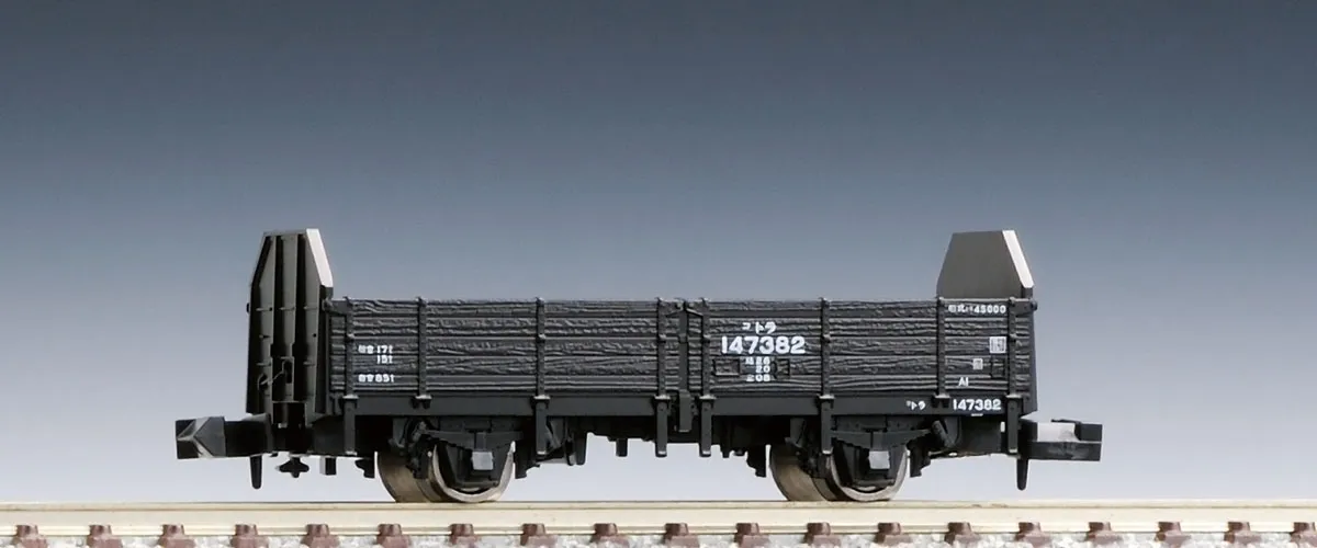 SKU: TMX02725 | Brand: Tomix | Product: Tomix N Tora 145000 Wagon N Scale model of the Tora 145000 type freight car, a Japanese National Railways two-axle open wagon introduced in 1960. Over 8,184 units were manufactured; variants remain operational. This model represents the 145000 series variant with wood floorboards and modified flat steel plate gables (converted from pressed steel). Features include pre-printed car numbers, silver wheels, and compatibility with mini-curve track systems when paired with compatible locomotives.