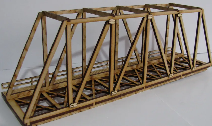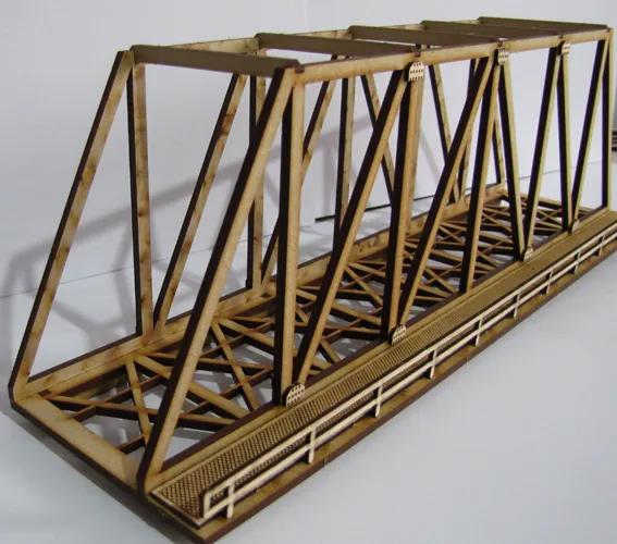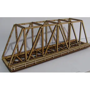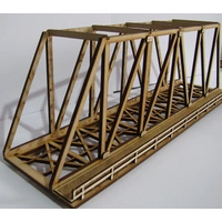 Scale– Laser Cut Single Truss Bridge This Truss Bridge has been designed to suit a single track HO scale crossing of upto 320mm. With an overall span of 320mm it is an impressive looking structure that will add a definite talking point on your set. We have added a sidewalk for a little difference so pedestrians and or the odd cyclist can now cross that hairy gorge or busy overpass in piece. Dont forget to look out for the Bridge Supports #SM052 specifically designed to match this bridge. Size :