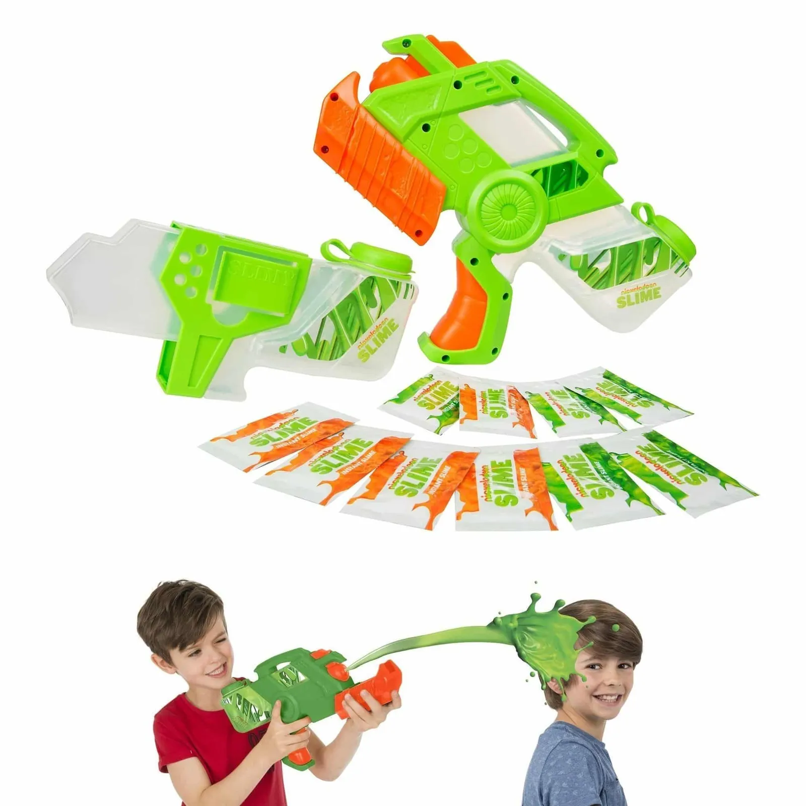The Nickelodeon Slime Hyper Blaster is the perfect toy to shoot gross, yucky slime! This awesome slime shooter has a range of up to 7 meters to drench your target in gooey, green slush! Included are 10 ‘just add water’ slime sache packs that you pour into the hyper blaster tank, fill with water, and load into the blaster. You’re now ready to take aim at anyone who stands in your way!