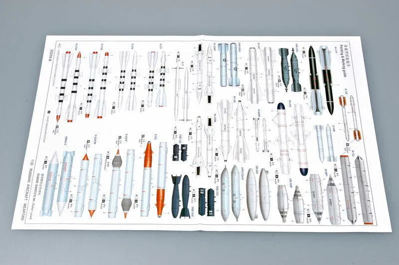 Description Set consists of 380 parts on 16 sprues. The following armaments can be made from this set: anti-radar missiles, anti-aircraft missiles, bombs, radar guided bombs, air-to-ground missiles, submunitions dispensers and many more. Specifically included are: R-27, R-27T, R-27ER/AE, R-60MK, R-73E, R-77, Kh-25ML, Kh-25MP, Kh-29L, Kh-29T, Kh-31P, Kh-35A, UB-32M/57, B-8M1, B-13L, S-24B, S-25OF, S-25OFM, S-25L, FAB-100, FAB-250, FAB-500, ZB-500, KAB-500Kr, KAB-500L, KMGU-2, UPK-23/250, PTB-1500, PTB-1150. View All Close