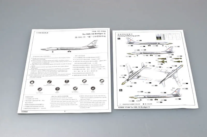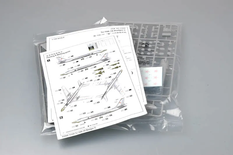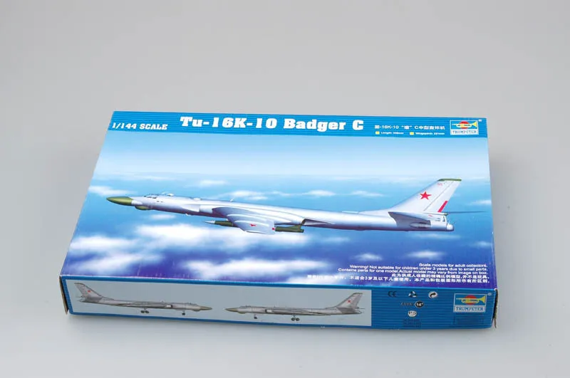 Description This is an injection-plastic jet aircraft model kit. A reissue of Trumpeter's Badger, this time with the "duckbill" radome for the K-10 version. Even in 1/144 scale this is still a decent-sized model, with a 23cm wingspan (about 9 inches). Features a complete cockpit, decent landing gear, three huge missiles, and decals for two Soviet aircraft.
