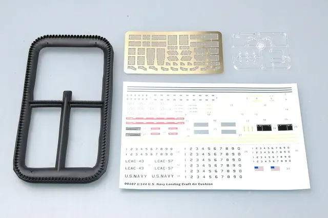 Description First of its kind in plastic kit form! The Landing Craft Air Cushion (LCAC) is a high-speed, over-the-beach fully amphibious landing craft capable of carrying a 60-75 ton payload. Capable of operating from ship decks, it is used to transport weapons systems, equipment, cargo and personnel from ship to shore and across the beach. The advantages of air-cushion landing craft are numerous. They can carry heavy payloads, such as an M-1 tank, at high speeds. Their payload and speed mean more forces reach the shore in a shorter time, with shorter intervals between trips. Kit consists of 238 parts on 6 sprues, plus photo etched nets and sweeper. Completed kit measures over 7" long. View All Close