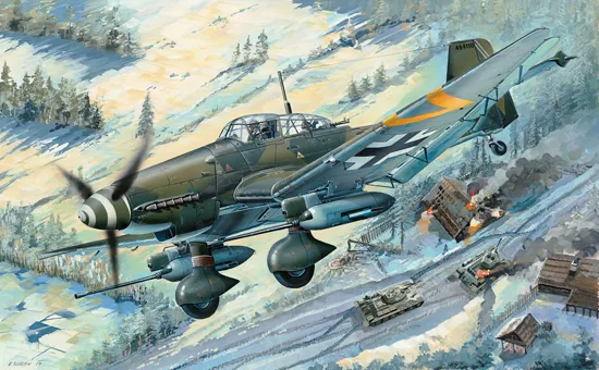 :The Ju 87G is the anti tank version of the Stuka family.They were armed with two 37-mm cannon which were very effective against Russian armour.The Ju 87G-2 were transformed from several Ju 87D-5s.