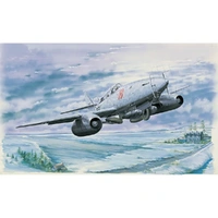 The Me262 was the first and only fully operational jet-powered fighter aircraft developed during World War II. Because of the special handling characteristics of a jet-powered aircraft verses a propeller driven one, a two seat training conversion became necessary. This was designated the Me262B-1a, and was equipped with a second seat for the instructor along with full dual controls, and a pair of external fuel tanks. The need for the night fighter version out weighed the extra time it took to complete the modifications, so therefore it was decided to simply adopt the trainer version by adding the FuG218 Neptun radar system and the FuG350 Naxos heat sensing unit, which allowed the fighter to track the exhaust of the British planes. This was designated the Me262B-1a/U1, and the first of these aircraft were delivered to the experimental night fighting unit Kommando Welter during February - March of 1945. This unit served in the defense of Berlin and became NJG11, but by the end of the war, they had only received a dozen of these new jet aircraft:
