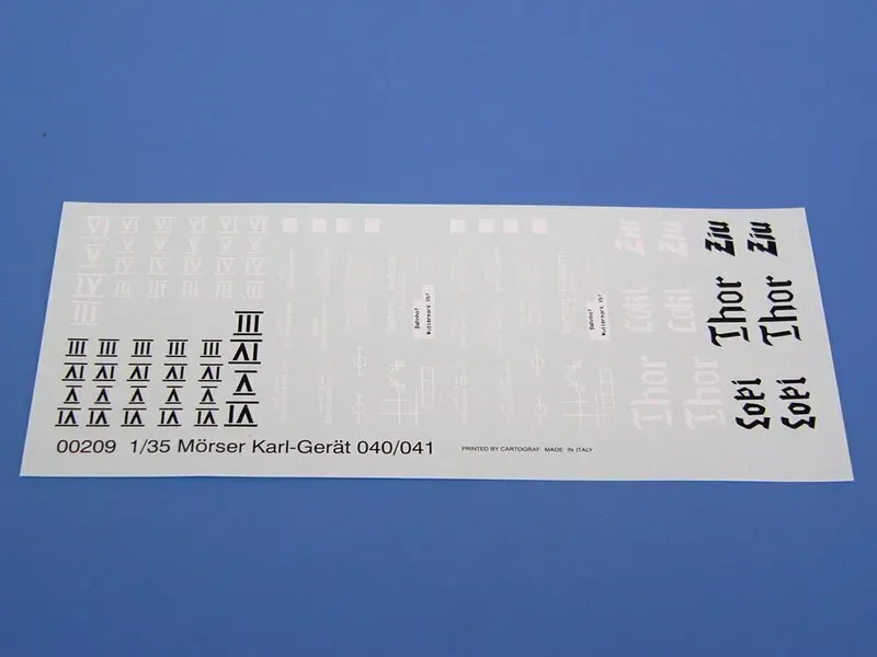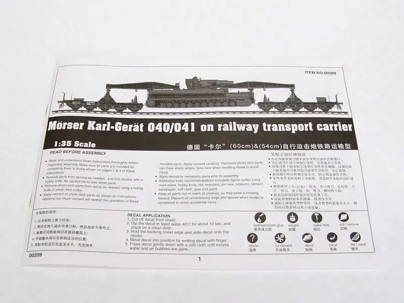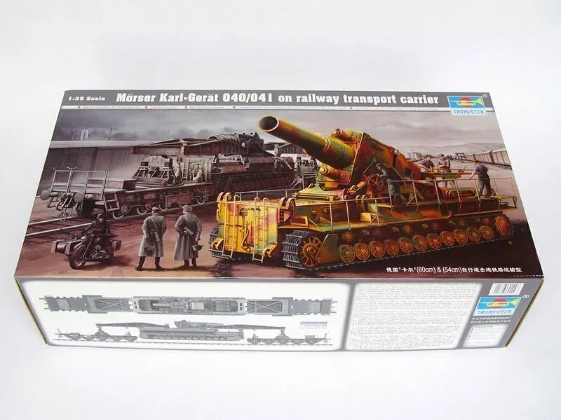 Description This is an injection-plastic field gun model kit. With this gigantic 840mm long SP Mortar on the railroad carriage wagons, Trumpeter outrun Dragon Models in quality at last. As Trumpeter did with their 28cm Railway Gun K5(E) Leopord (TRP00207), this model also has very highly detailed railroad carriage wagons especially designed for this SPM. SPM itself is the convertible of either 60cm mortar model or 54cm mortar model. It has much more details than the previously released models with 1251 pieces of plastic parts. Trumpeter gave some part of the running gears(torsion bars and road wheels lock up system) which be able to see in the interior of the hull. This is the first reproduce of this mechanism being always neglected. Tracks are rubber band type. Two set of PE parts. Thouroughly reaserched decal is printed by Cartograf. No figures included. Track beds are provided. This classical looking reveted steel monster will worth your money!