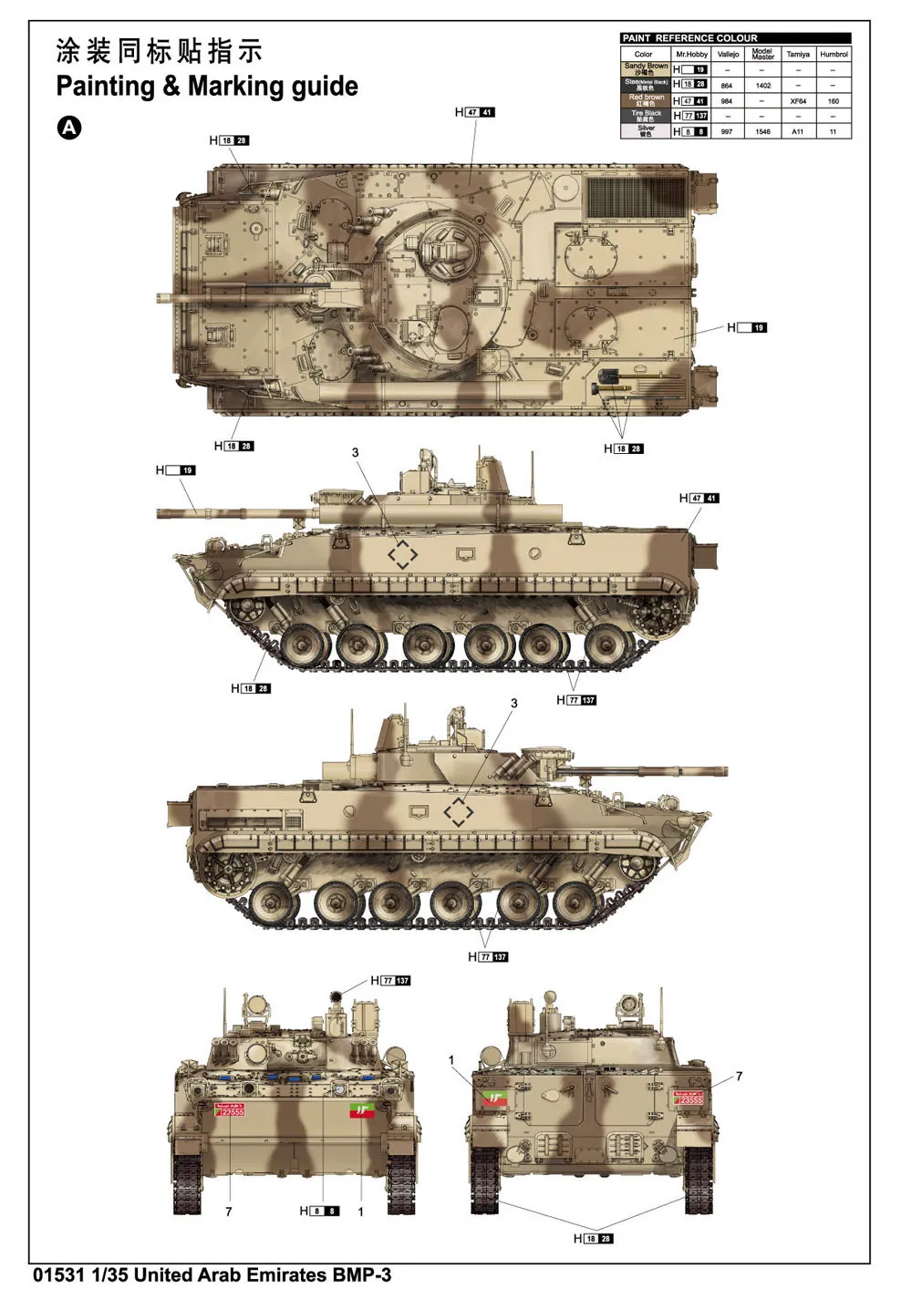Description This is an injection-plastic military vehicle model kit. Trumpeter's third kit of the modern Russian BMP-3 Infantry Fighting vehicle is a UAE version and features fantastic detail and crisp molding. Includes interior detail, photo-etched metal parts, and markings for two variations. Hatches can be posed open or closed. Tracks are non-workable injection-molded indy links.