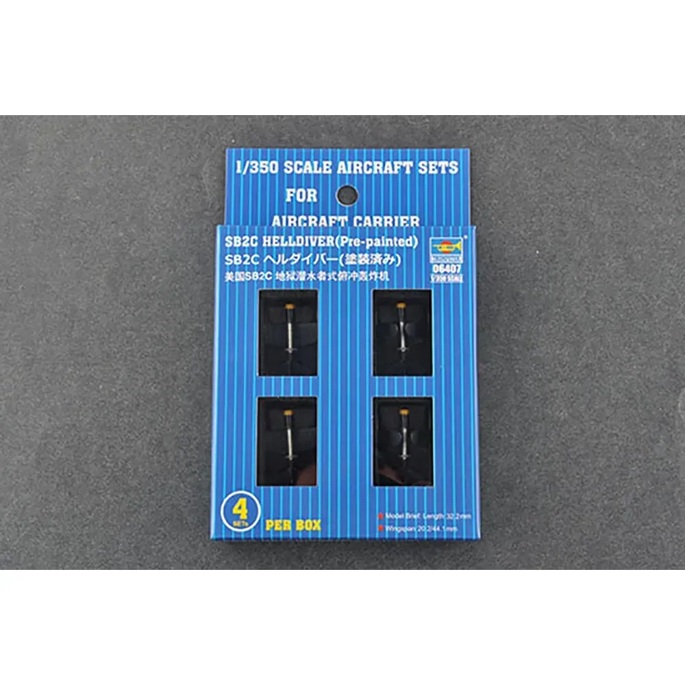 Accessory pack of aircraft for 1/350 scale ships from Trumpeter. 4 pre-painted aircraft included, 2 with wings folded. Requires paint and glue.