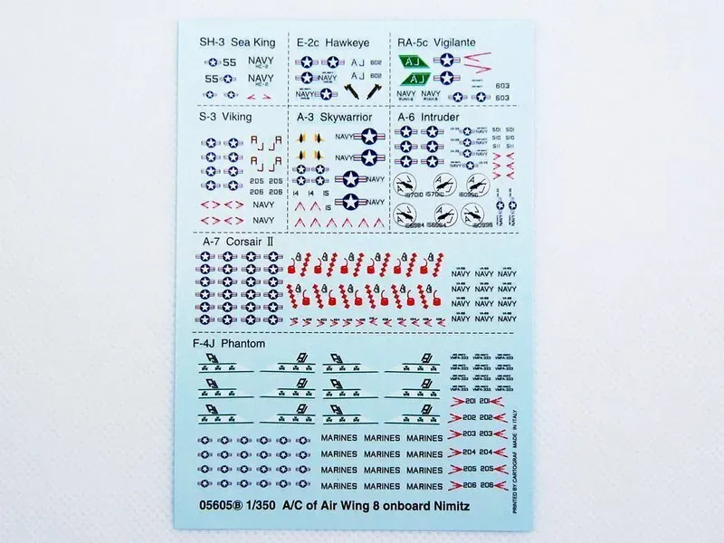 More Features : Either waterline version or full hull version can be selected; Include 6 Phantoms, 3 Intruders, 6 Corsair II s, 1 Hawkeye, 1 Vigilante, 2 Vikings, 2 Skywarriors, 1 sea King, total 8 types 22 aircraft with clear canopy, folding wings, especially with clear fuselage and folding rotor on the helicopter.
