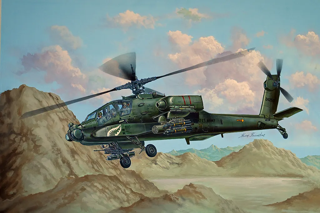 The AH-64A Apache is the US Army's primary attack helicopter. Its rapid response capabilities and onboard weapons systems enable deep strikes and delay of enemy forces. The Apache can be deployed globally, operating at night and day, and in adverse weather conditions. Its primary weapons are a nose-mounted 30mm M230 chain gun, Hellfire anti-tank missiles under its stub wings, and 70mm Hydra rockets. It can engage enemy armored vehicles or key targets. The Apache is equipped with comprehensive emergency survivability equipment, capable of withstanding multiple hits of 23mm rounds in critical areas. The AH-64 is transportable by C-5, C-141, and C-17 transport aircraft.