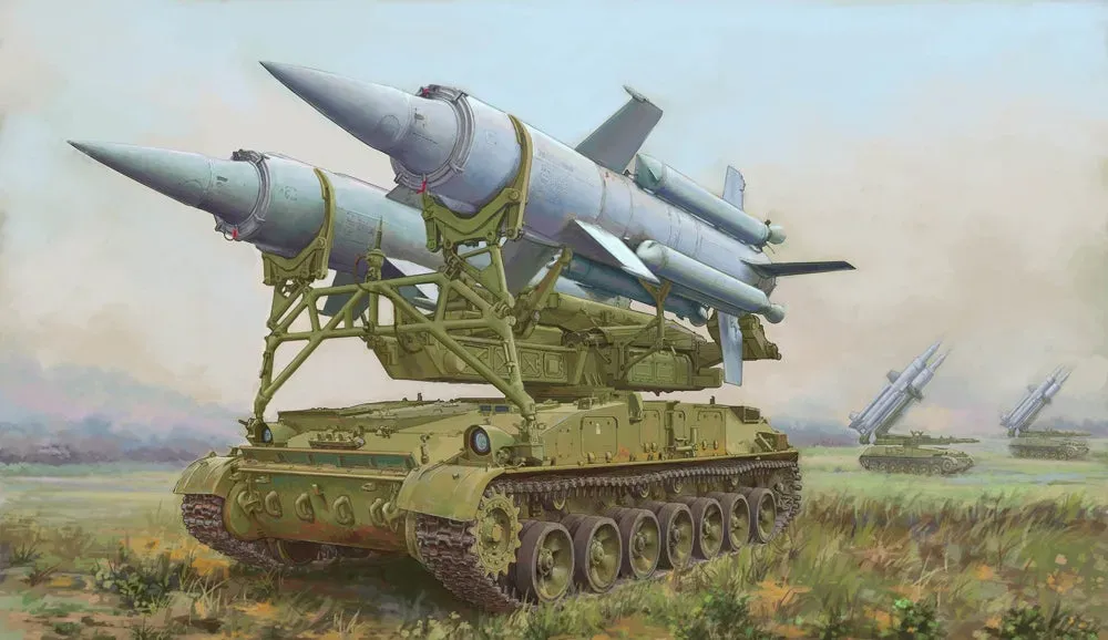 Soviet 2K11A TEL w/9M8M Missile "Krug-A" (SA-4 Ganef). The 2K11A “Krug” is a Soviet and now Russian long-range, medium-to-high altitude surface-to-air missile (SAM) system. "2K11A" is its GRAU (Russian MoD) designation, while "SA-4 Ganef" is its NATO reporting name. The system was designed by NPO Novator and produced by Kalinin Machine Building Plant in the central Urals. • 3 sprues, upper & lower hull, tracks • L: 120mm, W: 65.7mm, • Total parts 80+ • 1:72 scale plastic model kit from Trumpeter, requires paint and glue