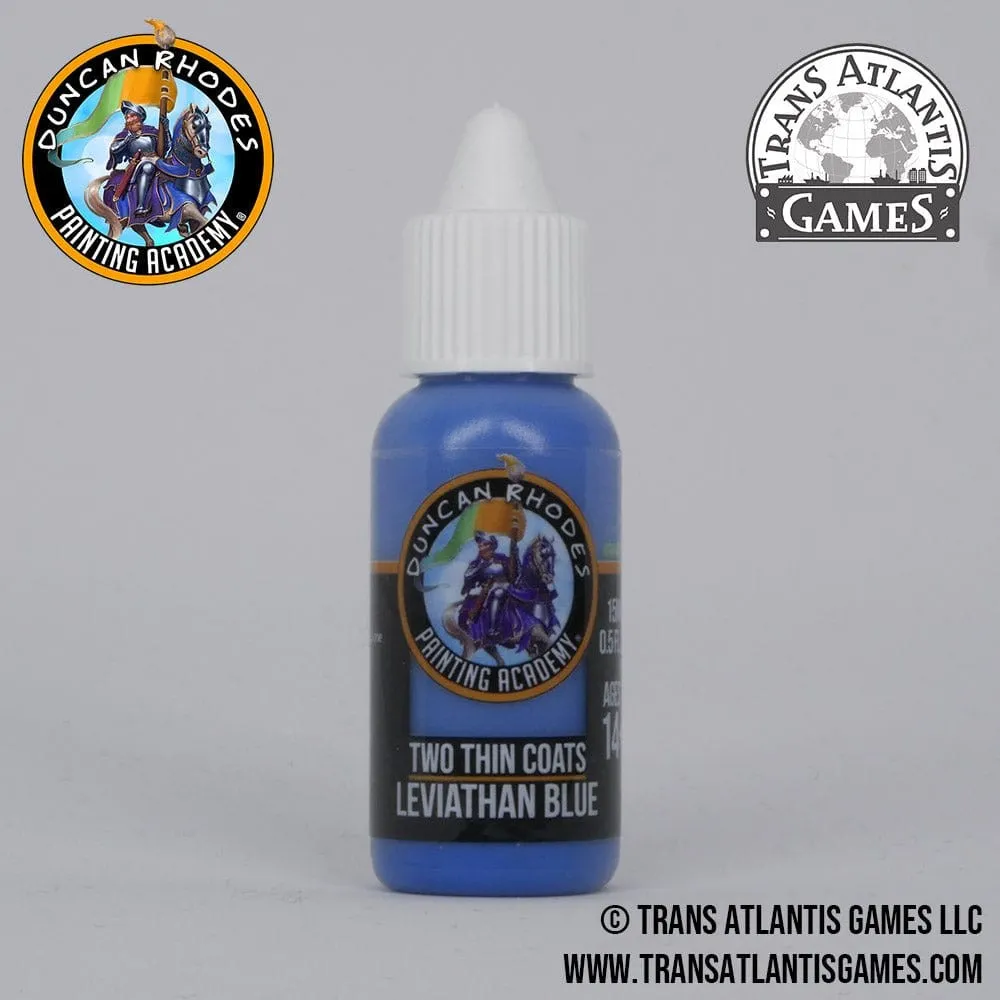 This is a bottle of Two Thin Coats - Leviathan Blue 15ml The Duncan Rhodes Painting Academy "Two Thin Coats" Paint Range is a range of paints developed from the ground up with some of the best paint development chemists in the world. These are not paints we just bought off the shelf and bottled. We developed each colour to meet our high standards of what we thought a miniature paint should be. We have been working in partnership with Trans Atlantis Games to create a set of paints that would be useful to any level of hobbyist. Whether you are a beginner or a seasoned painter, we believe that you'll find using these paints an absolute joy to use! We are both extremely excited for hobbyists around the world to get their hands on these paints and to give them a whirl . . . or to apply two thin coats!