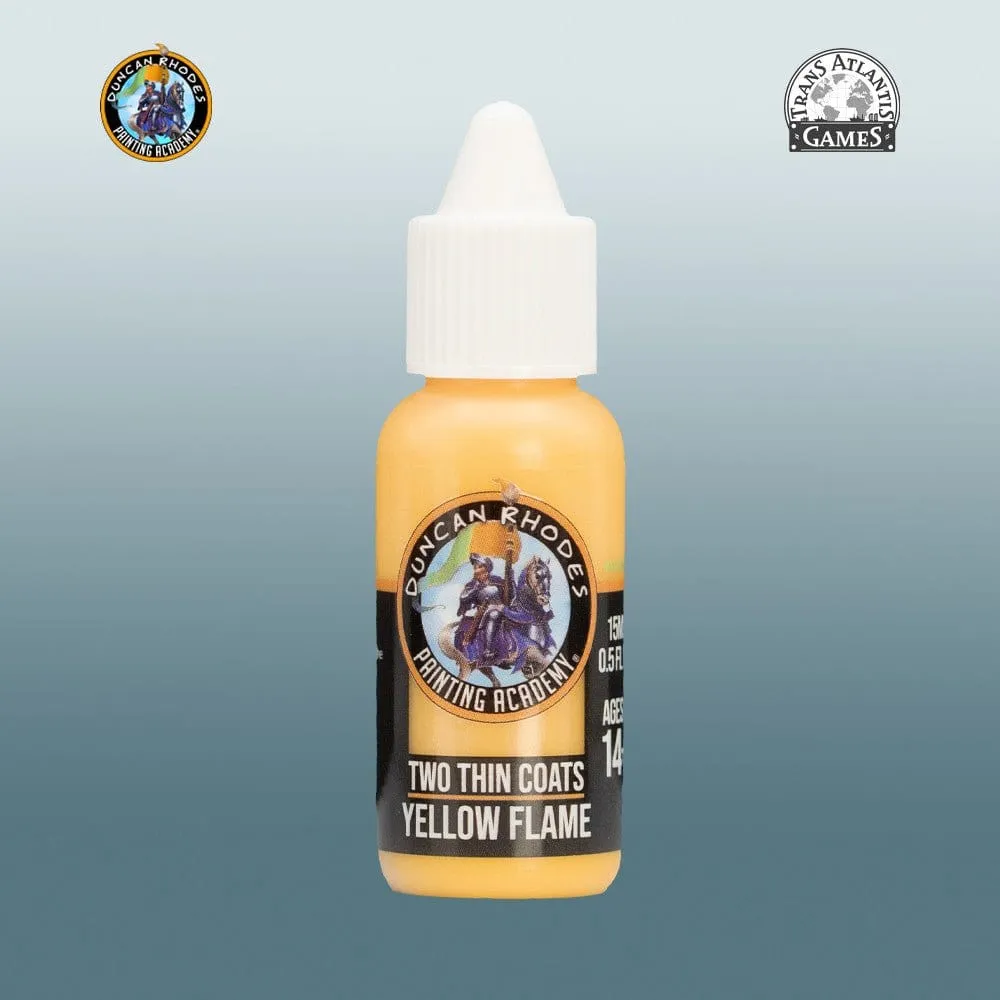 This is a bottle of Two Thin Coats - Yellow Flame 15ml The Duncan Rhodes Painting Academy "Two Thin Coats" Paint Range is a range of paints developed from the ground up with some of the best paint development chemists in the world. These are not paints we just bought off the shelf and bottled. We developed each colour to meet our high standards of what we thought a miniature paint should be. We have been working in partnership with Trans Atlantis Games to create a set of paints that would be useful to any level of hobbyist. Whether you are a beginner or a seasoned painter, we believe that you'll find using these paints an absolute joy to use! We are both extremely excited for hobbyists around the world to get their hands on these paints and to give them a whirl . . . or to apply two thin coats!