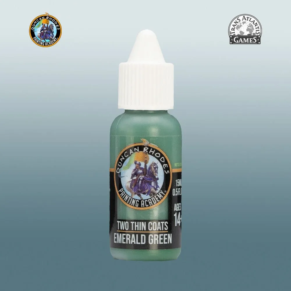 This is a bottle of Two Thin Coats - Emerald Green 15ml The Duncan Rhodes Painting Academy "Two Thin Coats" Paint Range is a range of paints developed from the ground up with some of the best paint development chemists in the world. These are not paints we just bought off the shelf and bottled. We developed each colour to meet our high standards of what we thought a miniature paint should be. We have been working in partnership with Trans Atlantis Games to create a set of paints that would be useful to any level of hobbyist. Whether you are a beginner or a seasoned painter, we believe that you'll find using these paints an absolute joy to use! We are both extremely excited for hobbyists around the world to get their hands on these paints and to give them a whirl . . . or to apply two thin coats!