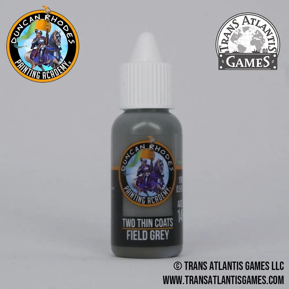 This is a bottle of Two Thin Coats - Field Grey 15ml The Duncan Rhodes Painting Academy "Two Thin Coats" Paint Range is a range of paints developed from the ground up with some of the best paint development chemists in the world. These are not paints we just bought off the shelf and bottled. We developed each colour to meet our high standards of what we thought a miniature paint should be. We have been working in partnership with Trans Atlantis Games to create a set of paints that would be useful to any level of hobbyist. Whether you are a beginner or a seasoned painter, we believe that you'll find using these paints an absolute joy to use! We are both extremely excited for hobbyists around the world to get their hands on these paints and to give them a whirl . . . or to apply two thin coats!