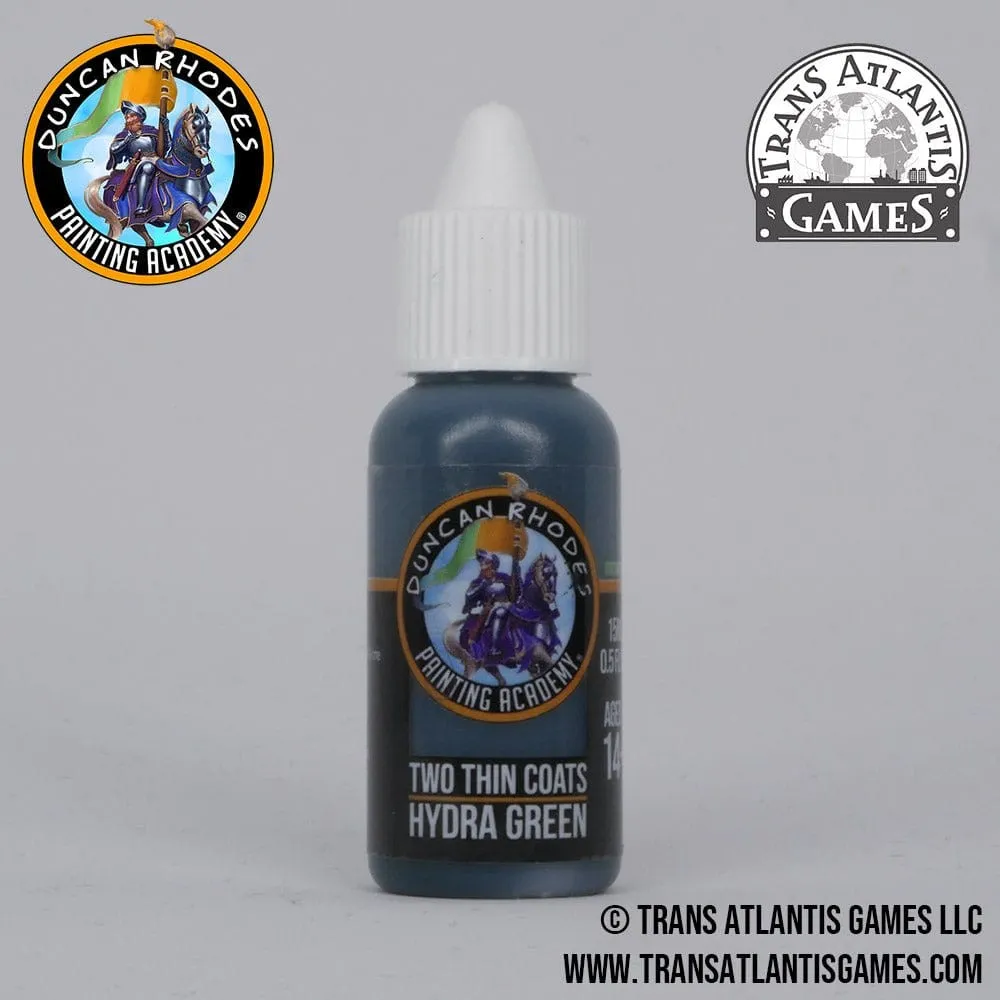 This is a bottle of Two Thin Coats - Hydra Green 15ml The Duncan Rhodes Painting Academy "Two Thin Coats" Paint Range is a range of paints developed from the ground up with some of the best paint development chemists in the world. These are not paints we just bought off the shelf and bottled. We developed each colour to meet our high standards of what we thought a miniature paint should be. We have been working in partnership with Trans Atlantis Games to create a set of paints that would be useful to any level of hobbyist. Whether you are a beginner or a seasoned painter, we believe that you'll find using these paints an absolute joy to use! We are both extremely excited for hobbyists around the world to get their hands on these paints and to give them a whirl . . . or to apply two thin coats!