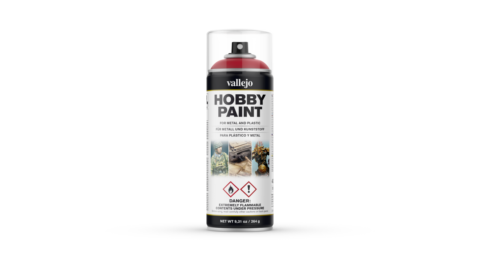 The Vallejo Hobby Paint Sprays are a perfect combination of base coat and highly pigmented color, developed for use on all metal, plastic and resin models and miniatures. Our new original and unique AV spray formula leaves a perfect matt and self levelling finish, designed to respect and bring forth even finest details of the models and miniatures.The Vallejo Hobby Paint Spray assortment includes 3 Basic colors, 19 Fantasy shades, 5 WWII AFV, 4 WWII Infantry colors and 3 varnishes (34 colors in total). The new Spray Colors are a perfect match to the corresponding shades available in our Game and Model Color ranges, so both painting techniques can be combined.Each Hobby Paint Spray shows the original color applied on the colored ring around the top and is equipped with 2 different nozzles; one with a low discharge flow, especially recommended for fine lines and small details, and the other with a medium discharge flow, recommended for thicker lines and for covering larger surfaces; the low pressure valve allows for excellent spray control.The range is complemented with 3 different varnishes- Gloss, Matt and Satin- recommended for providing extra protection when handling your figures and to give them an overall uniform appearance.