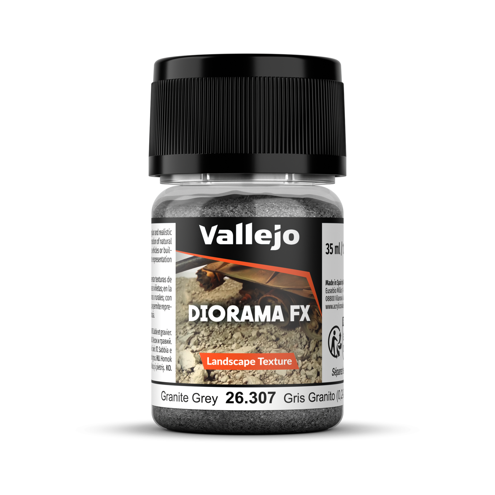 SKU: AV26307 | Brand: Vallejo | Product: Vallejo Diorama FX Landscape Textures Granite Grey 35ml Vallejo Diorama FX Landscape Textures Granite Grey 35ml [26307] replicates the fine particulate composition of granite found in volcanic terrain, quarries, and architectural applications. The mottled grey tones capture the mineral diversity of magma-derived rock. Use this fine texture to base dioramas with geological authenticity and tactile realism. Grain size: 0.2-0.6 mm Packaging: 35 ml/1.18 fl oz pot Safety: Always read and follow the information on the product label. Contains 1,2-benzisothiazol-3(2H)-one, reaction mass of 5-chloro-2-methyl-2H-isothiazol-3-one and 2-methyl-2H-isothiazol-3-one (3:1). May produce an allergic reaction.