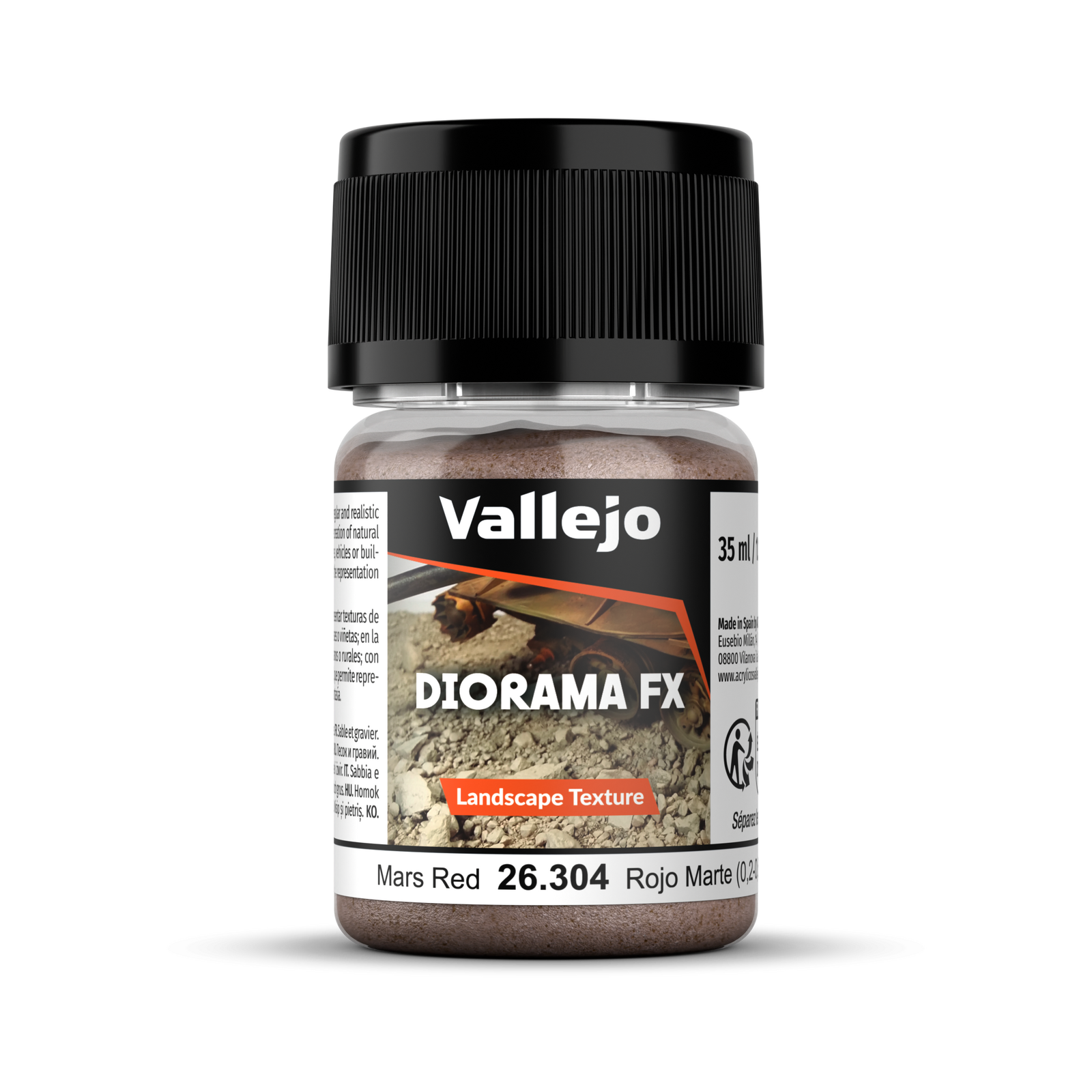 SKU: AV26304 | Brand: Vallejo | Product: Vallejo Diorama FX Landscape Textures Mars Red 35ml Vallejo's Mars Red texture replicates the warm, iron-oxide tones found in Mediterranean soils, hematite-rich deposits, and Martian landscapes. Fine grain (0.2-0.6 mm) renders smooth, detailed ground surfaces suitable for armored vehicles, historical miniatures, or sci-fi figures. 35 ml/1.18 fl oz container. Layer with complementary textures to build realistic stratified terrain. Safety: Read and follow all product label instructions. Contains 1,2-benzisothiazol-3(2H)-one, reaction mass of 5-chloro-2-methyl-2H-isothiazol-3-one and 2-methyl-2H-isothiazol-3-one (3:1). May cause allergic reactions.