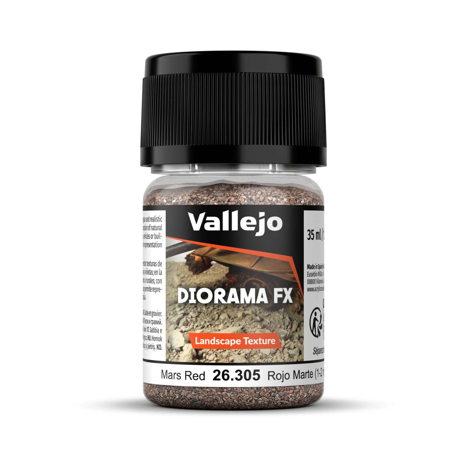 SKU: AV26305 | Brand: Vallejo | Product: Vallejo Diorama FX Landscape Textures Mars Red 35ml Vallejo's Mars Red texture replicates the warm, iron-oxide tones found in Mediterranean soils, hematite-rich deposits, and Martian landscapes. Medium grain (1-2 mm) creates visible surface variation for dynamic terrain effects. 35 ml/1.18 fl oz container. Combine with other landscape textures to achieve varied geological strata and authentic ground composition. Safety: Read and follow all product label instructions. Contains 1,2-benzisothiazol-3(2H)-one, reaction mass of 5-chloro-2-methyl-2H-isothiazol-3-one and 2-methyl-2H-isothiazol-3-one (3:1). May cause allergic reactions.