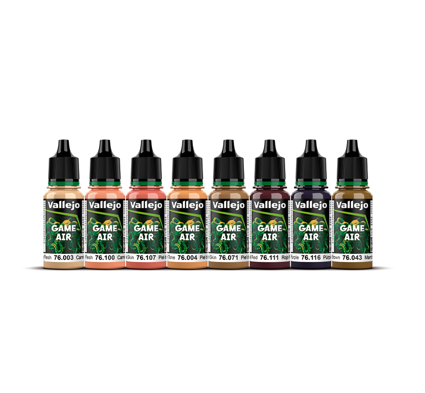 This new set includes a renewed selection of colors, with the new formulation of the Game Air range, designed to facilitate the painting of human skins in fantasy, wargames and sci-fi miniatures, with smooth transitions, realistic tones and a professional approach.