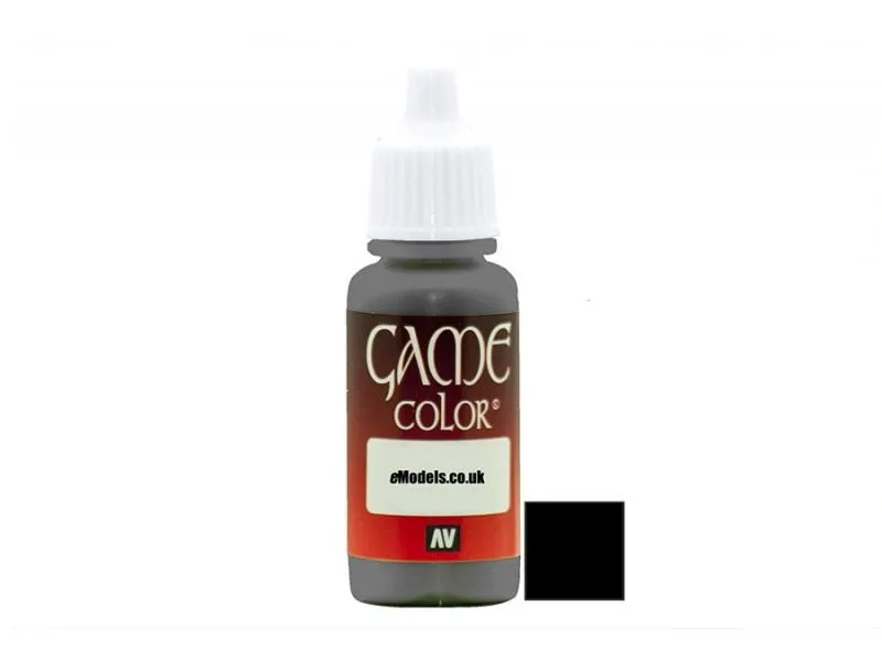 SKU: AV72051 | Brand: Vallejo | Product: Vallejo Game Colour Black 18ml Acrylic Paint - New Formulation Water-based acrylic paint formulated with a matte, opaque finish for brush application. Developed in partnership with professional miniature painters specializing in fantasy figures and dioramas, this paint incorporates a revolutionary resin compound that resists wear and damage from repeated handling—essential for gaming pieces subject to frequent play. Apply over a primed surface for optimal results. The paint cures quickly, creating an even, self-leveling coating that maintains fine detail without obscuring surface features. Adheres reliably to resin, plastic, metal, and white metal substrates. Water-soluble for tool cleanup. Non-flammable and solvent-free.