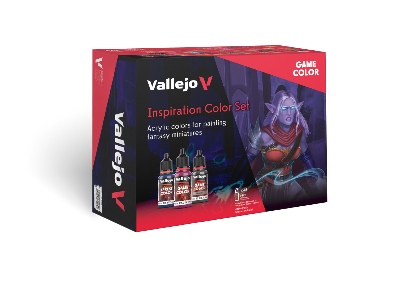 This impressive box includes a careful selection of 48 colors, covering a wide variety of products from the Game Color range, perfect for any fantasy miniature painting project. Features - Game Color: 32 vibrant, matt colors for flawless coverage. - Game Color Metallic: 2 metallic shades for realistic finishes on your metals. - Game Color Ink: 2 highly pigmented colors to create shadows and enhance details. - Game Color Wash: 2 colors that will help you modify tones and add depth to your miniatures. - Game Color Fluo: 2 fluorescent colors for bright and striking effects. - Game Color Special FX: 2 special effects to bring your projects to life with unique and stunning finishes. - Xpress Color: 4 high intensity colors that allow fast application and a high-contrast finish. - Auxiliary Products: Airbrush Thinner and Gloss Polyurethane Varnish, ideal for modifying the properties of the paint and give them the finish you require. - Synthetic Brushes: A set of three versatile and durable brushes, designed to offer precision in every stroke and suitable - for all types of paint included in the set. - Game Color User Guide: Full of tips and techniques to help you get the most out of your paints. Vallejo paints are known for their high pigmentation and great fluidity, providing professional results with every use. With a wide range of colors and products, this set allows you to explore endless creative possibilities and advanced painting techniques. The sturdy, compact box keeps your paints and brushes organized and ready to use anytime, anywhere. Whether you’re a beginner painter or an experienced artist, Inspiration Color Set is the ultimate tool to transform your miniatures into masterpieces. Contents 48 x 18 ml/0.6 fl oz Game Color + Set Brushes + User Guide - 72.001 Dead White - 72.034 Bone White - 72.107 Athena Skin - 72.099 Skin Tone - 72.004 Elf Skin Tone - 72.071 Barbarian Skin - 72.109 Toxic Yellow - 72.006 Sun Yellow - 72.008 Orange Fire - 72.106 Scarlet Blood - 72.111 Nocturnal Red - 72.112 Evil Red - 72.014 Warlord Purple - 72.015 Hexed Lichen - 72.116 Midnight Purple - 72.117 Elfic Blue - 72.022 Ultramarine Blue - 72.019 Night Blue - 72.021 Magic Blue - 72.096 Verdigris - 72.024 Turquoise - 72.027 Scurvy Green - 72.032 Scorpy Green - 72.029 Sick Green - 72.028 Dark Green - 72.035 Dead Flesh - 72.040 Leather Brown - 72.115 Grunge Brown - 72.045 Charred Brown - 72.047 Wolf Grey - 72.102 Steel Grey - 72.051 Black - 72.053 Chainmail - 72.056 Glorious Gold - 72.087 Violet Ink - 72.091 Sepia Ink - 72.158 Fluorescent Magenta - 72.104 Fluorescent Green - 73.203 Umber Wash - 73.201 Black Wash - 72.601 Fresh Blood - 72.610 Galvanic Corrosion - 72.404 Nuclear Yellow - 72.407 Velvet Red - 72.412 Storm Blue - 72.417 Snake Green - 71.261 Airbrush Thinner - 72.650 Gloss Polyurethane Varnish