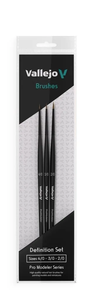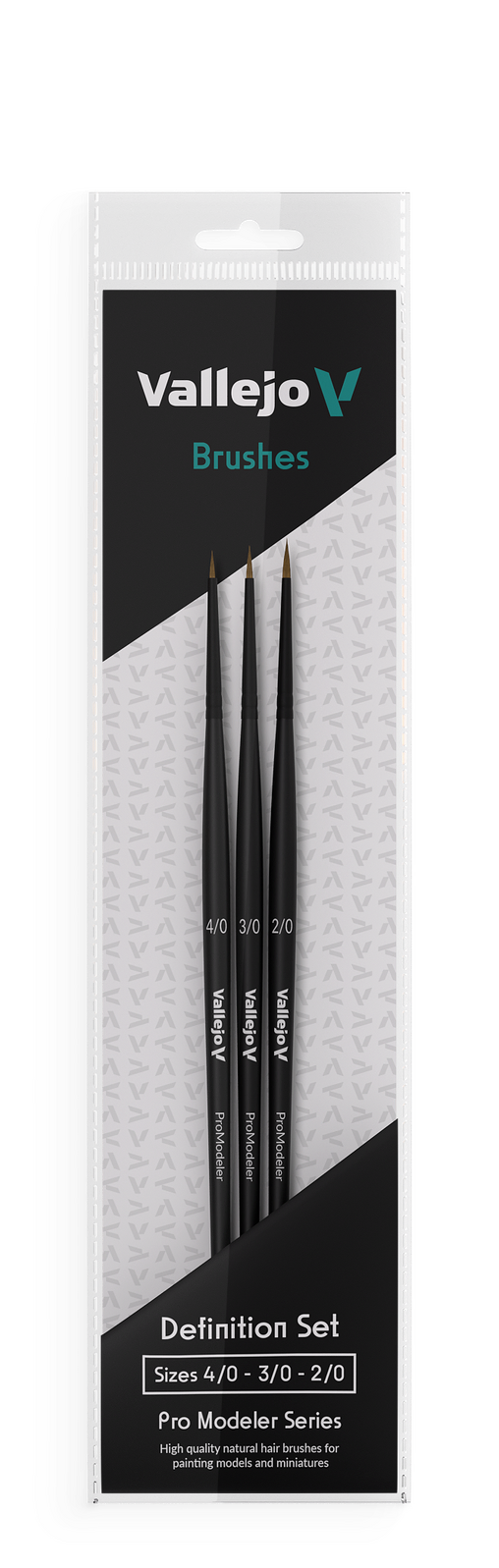 Pro Modeler Range: If you are looking for high quality brushes, the Vallejo Pro Modeler series is perfect for you. These round brushes, made from premium natural hair, offer flexibility, smooth, flowing strokes and high wear resistance. Available in a range of sizes from no. 10/0 to 4, they are ideal for both large surface work and fine detailing - bring your figures to life with precision and mastery! Definition Set: An assortment of three brushes designed for precision work and small detail painting. Includes sizes 4/0, 3/0 and 2/0.