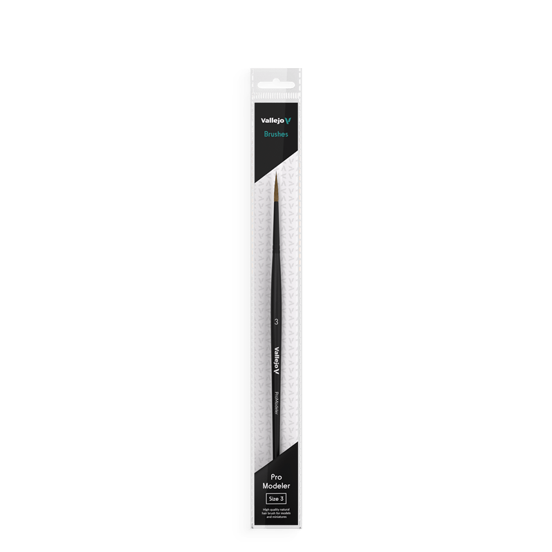This is the Vallejo Hobby Brushes: Pro Modeler Natural Hair Round Brush No. 3 Round brushes, made from premium natural hair. Offer flexibility, smooth, flowing strokes and high wear resistance. Available in a range of sizes from no. 10/0 to 4, they are ideal for both large surface work and fine detailing.
