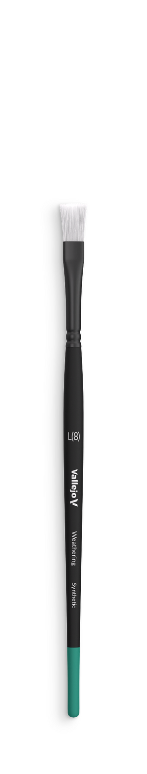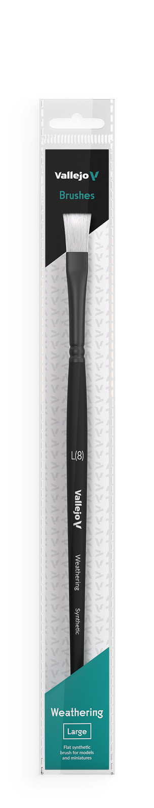 This is the Vallejo Hobby Brushes: Weathering Flat Synthetic Brush Large Perfect brushes for creating textured effects. With flat, durable synthetic fibers, they are ideal for applying textures and pigments on terrains and achieving stunning weathering effects on models. They are also suitable for applying varnishes and gels. Available in three sizes: S, M and L.