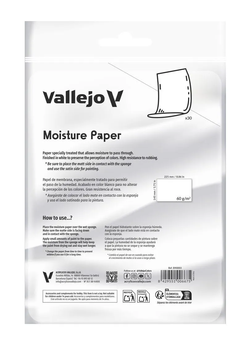 SKU: AVB90003 | Brand: Vallejo | Product: Vallejo Wet Palette Moisture Paper Sheets (30) Refill pack containing 30 sheets of specially treated moisture paper for the Wet Palette Pro Painter Size. The white-finish paper maintains color accuracy while promoting moisture transfer, with strong resistance to friction damage. Orient the matt surface against the sponge base and the satin surface toward your work area.