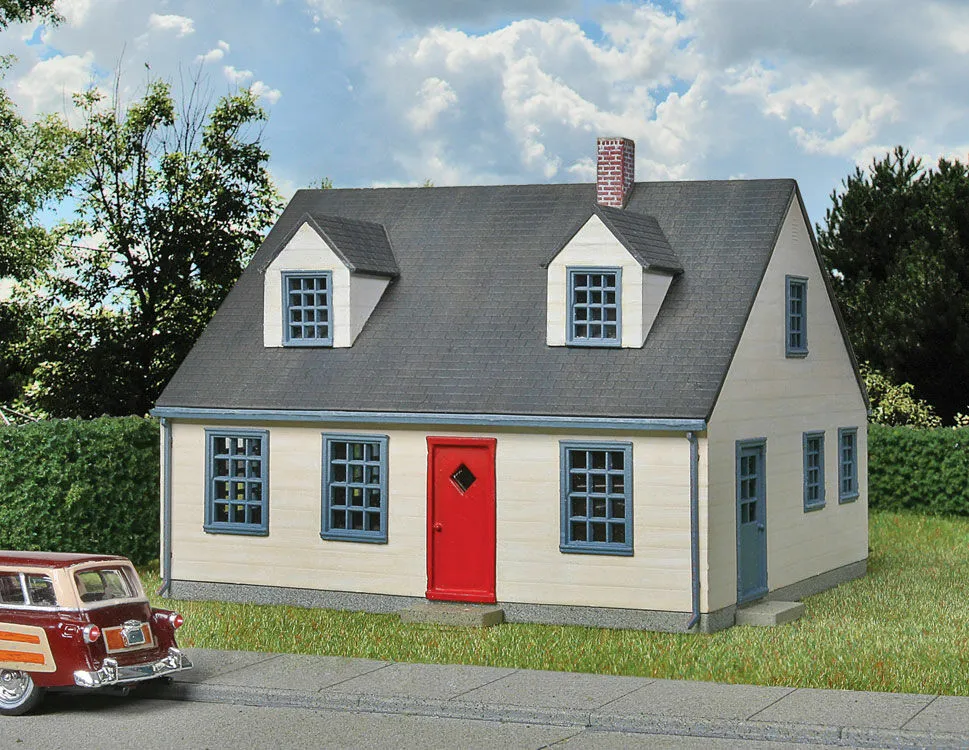 The Walthers Cornerstone Cape Cod House is typical of homes constructed across the continent beginning in the mid-1950s and thousands are still in use today. This two-story frame house looks at home in neighborhood scenes as well as in older city neighborhoods.