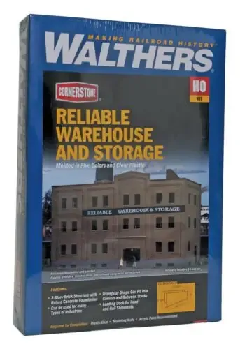 Walthers Cornerstone HO Scale Reliable Warehouse and Storage is a great factory or warehouse that's easily placed on any layout. The growth of railroads in the late 19th century attracted new industries to the right-of-way. Businesses located close to the tracks, often on odd-shaped lots. These structures are still common. The triangular shape is ideal for corners or between a mainline and spur. A roof-top water tower, stairway, chimney and loading dock are all included. Great for steam-era and transition-era scenes, many structures like Reliable Warehouse and Storage still stand today. Reliable Warehouse and Storage a wonderful addition layotu scenes amont other Cornerstone HO Scale industry kits.