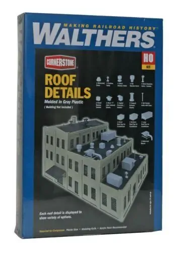 The Walthers Cornerstone HO Scale Roof Details set includes parts to add realism and interest to the most visible part of your structures. This set of building details includes parts to build the details in the list below. All parts are molded in gray. Use these Roof Details to add interest and detail to your Cornerstone HO Scale industrial buildings.