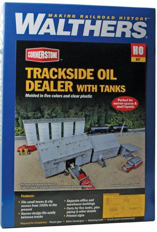 Prototypes for the Walthers Cornerstone Trackside Oil Dealer with Storage Tanks could be seen along North American railroad lines beginning in the 1920s as oil became popular for heating, industrial and automotive use. Oil arrived in tank cars and was transferred into on-site storage tanks. This versatile kit allows you to arrange it to fit available space. It includes a row of five tanks complete with rooftop walkways. A corrugated storage warehouse is perfect for loading barrels into trucks. At busy locations barrels would arrive in boxcars. A corrugated office and a pump house for filling up local delivery trucks can be arranged wherever needed. The Trackside Oil Dealer with Storage Tanks is just one of a wide selection of Cornerstone railroad-served industrial buildings.