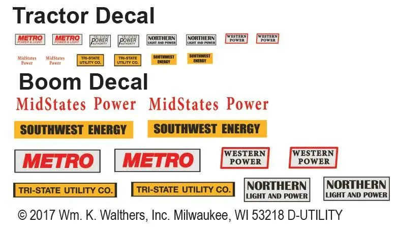 The model includes colorful utility company logo decals, including several that match Cornerstone(R) structure kits (available separately), sized to fit for quick conversion including Metro Power & Light, Tri-State Power Authority, Northern Light & Power, MidStates Power, Western Power, Tri-State Utility Co. and Southwest Energy.