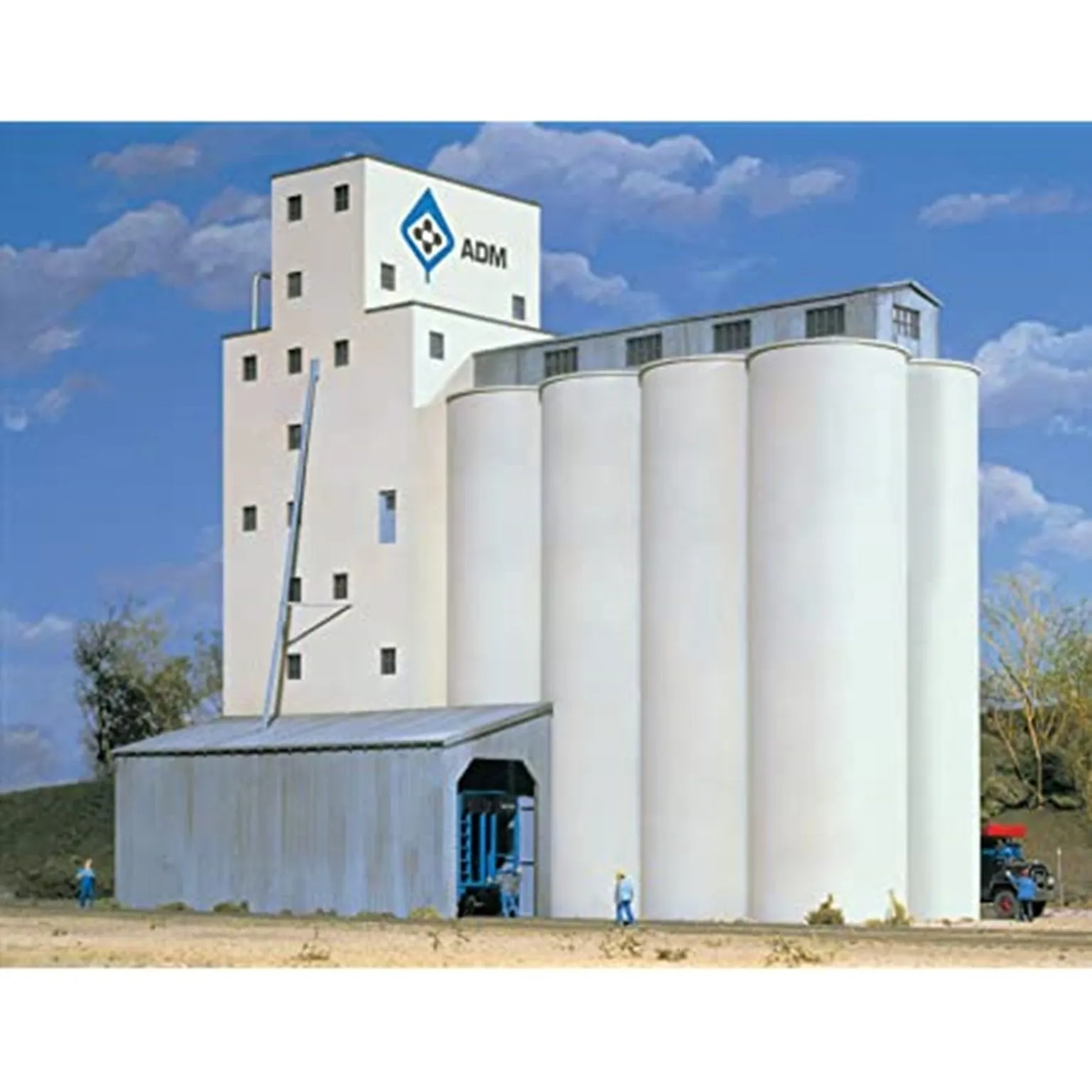 Typical design used across North America Eight silos and headhouse Corrugated loading-unloading shed Combine multiple kits to make a larger complex Use with other Cornerstone grain handling structures At home on the prairies or in urban or waterfront scenes Molded in appropriate colors and clear plastic window glazing Full-color decal signs